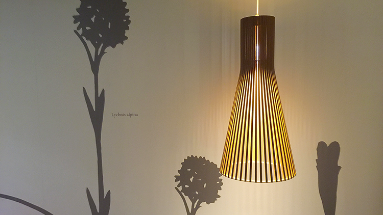 | Local plants identified on wall silhouettes. Timber banded light fittings form a theme throughout the room |