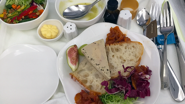 Soup, salad and foie gras came on one tray. Service on this flight was brusque, but observant. Rarely was there pro-active service, but all requests were met in a timely manner, and with grace and mostly a smile – and at worst a concentrated look.