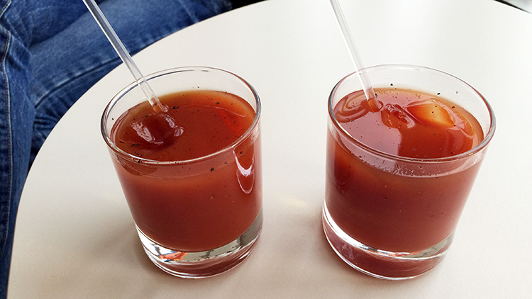 | Commencing the process of relaxation – Bloody Marys – and they were not the last consumed in the Skyteam Lounge before boarding. |