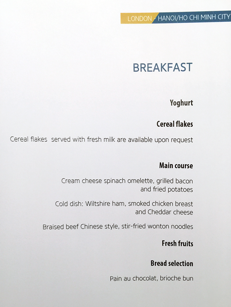 Amenity kits co-branded with Charriol were in contrast to the blue Chopard ones distributed on the Sydney to HCMC journey. Contents were pretty much the same but different branding. We were in the same seats as our outward journey for our 10 hour 40 minute flight to Ho Chi Minh City.