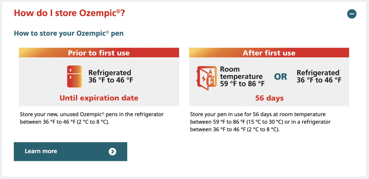 The first thing to know is that these medications don’t always need to be refrigerated. While they should be kept in the fridge before first use, once in use, they can safely be stored at room temperature for a limited time. For semaglutide-based medications like Ozempic and Wegovy, that window is typically up to 56 days, provided they are kept below 30°C (86°F). Mounjaro, has a shorter window at around 21 days under the same conditions.